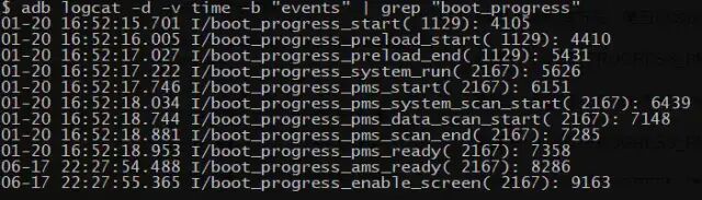 通过查看events.txt中搜索"boot_progress"关键字或者通过以下命令过滤日志输出
