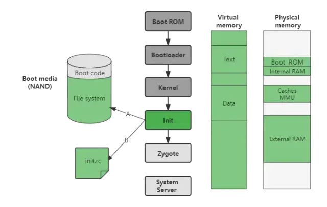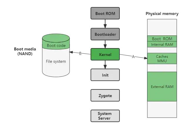 A. CPU刚上电时,CPU 处于未初始化状态,还没有设定内部时钟,此时只有内部 RAM 可用。当电源稳定后会开始执行 Boot ROM 代码。Boot ROM通过系统寄存器映射到 ASIC (Application Specific Integrated Circuit, 即专用集成电路,是指应特定用户要求和特定电子系统的需要而设计、制造的集成电路)中的物理区域来找到boot media,进而可以找到Bootloader