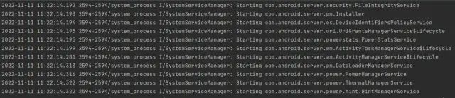 通过"boot_progress_"关键字分析日志,粒度较大,只能定位出大概的耗时流程,之后还需分析流程内部具体的耗时情况。开机各流程内部也有相应的日志,可以进行更加细致的分析。例如在SystemServiceManager.java类中启动服务时,会打印启动某项服务的日志。通过查看某个服务A与下一个服务的日志时间,可以计算出启动服务A的耗时。