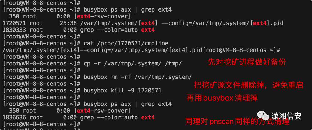 发现命令找不到或者被替换后,在不清楚挖矿病毒对哪些命令做了什么修改的情况下,可以直接使用busybox代替系统命令。这里在curl和wget都无法使用的情况下,可以换lrzsz或者scp等其他方式传一个busybox上去。使用busybox可以发现一个是挖矿进程,另一个是pnscan扫描进程。直接kill进程后会马上再起一个,所以用busybox先把源文件删除后再杀进程。
