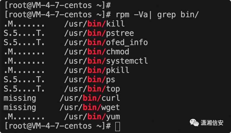 被入侵后在iptables中发现添加了规则,禁止外网访问仅允许本机访问6379端口。避免redis再被其他人入侵。用rpm比对被修改过的命令。missing表示命令找不到了,5代表MD5发生了改变,有可能对应的命令文件被替换或有修改。M则表示命令的权限发生了修改。