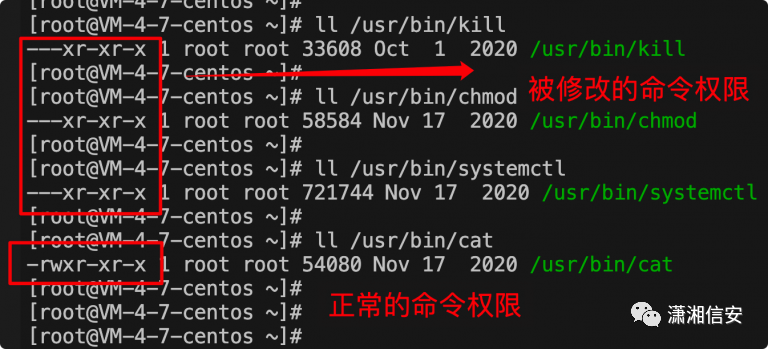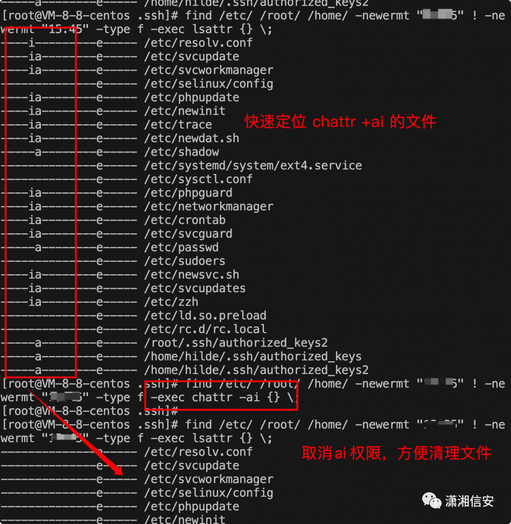 对于缺失的命令比如wget和curl,实际上是被重命名了。但是不清楚的情况下直接reinstall即可。对于系统命令可以使用yum whatprovides command 来查询对应的包名,以ps命令为例。ps命令被替换或修改过,想要恢复命令就可以使用yum reinstall procps-ng -y。清理的时候会发现,很多文件都使用了chattr不让其删除。像这样的文件往往有很多,配合上面的find命令可以将特定时间内的文件全部取消掉这些权限。![]()