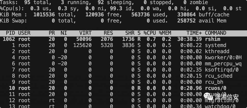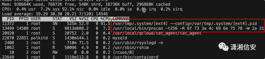 然后上机排查,发现cpu占用非常高,进程名为[ext4]。在linux通常系统进程外面会带有[],猜测这里是为了混淆视听,将挖矿的进程名带上括号。几分钟后使用top命令查看,发现挖矿进程不见了,但是系统依旧很卡。猜测做了进程隐藏或对命令劫持等手段。