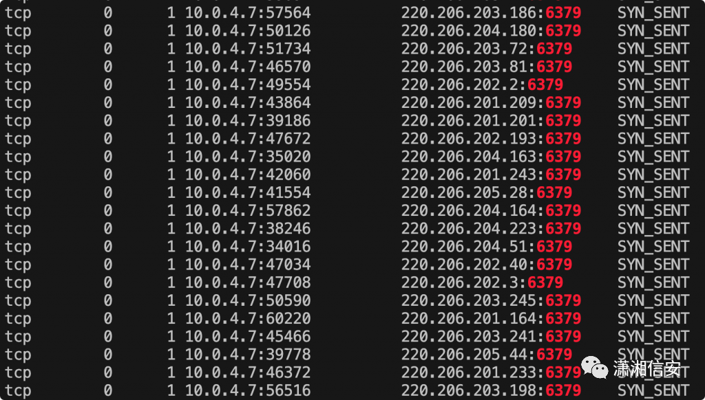 netstat查看网络请求发现大量对外发起了6379端口的扫描。这个是由pnscan发起的对外扫描,pnscan进程清理掉即可。