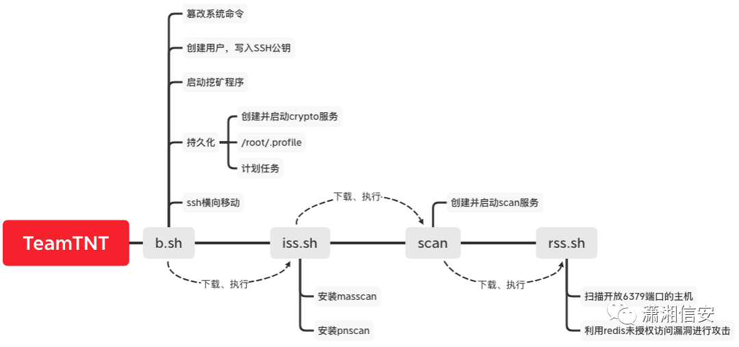先给出分析结论,TeamTNT挖矿家族主要通过两种方式入侵: