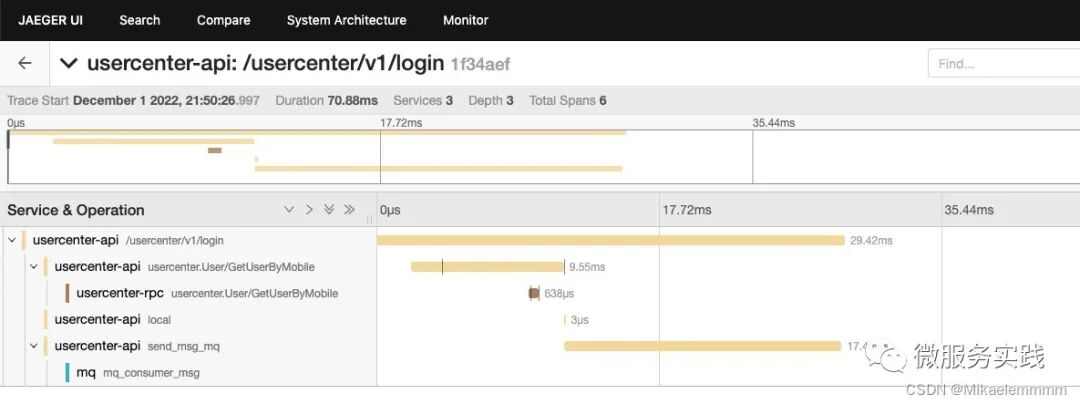 当调用完 rpc 的 GetUserByMobile 之后,api 调用了本地的 local,如果我们想在整个链路上体现出来调用了本地 local 方法,那默认的 go-zero 是没有帮我们做的,需要我们手动来添加。