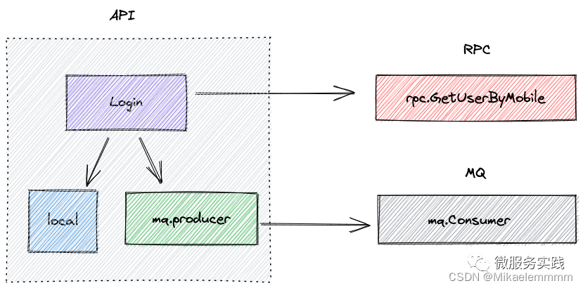我们先简单讲一下我们的小 demo 的场景,一个请求进来调用 api 的 Login 方法,在 Login 方法中先调用 rpc 的 GetUserByMobile 方法,之后在调用 api 本地的 local 方法,紧接着调用 rabbitmq 传递消息到 mq 服务。