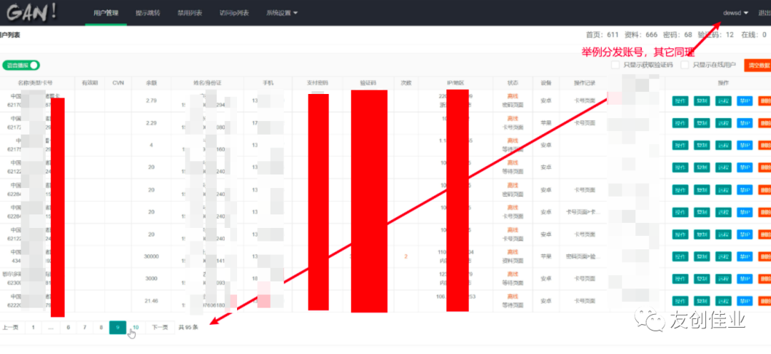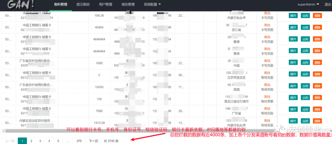 直接管理员登录看下功能界面,可以看到,已经有数千人已经被诈骗,受害者的姓名、身份证、银行卡号、最新余额、支付密码,短信验证码、IP归属地等信息已经被诈骗团伙钓到:![]()