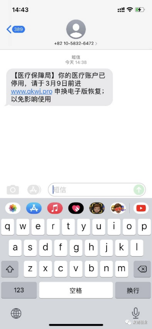 诈骗短信,通过内容中的域名即可看到是打着医保幌子的典型电信诈骗