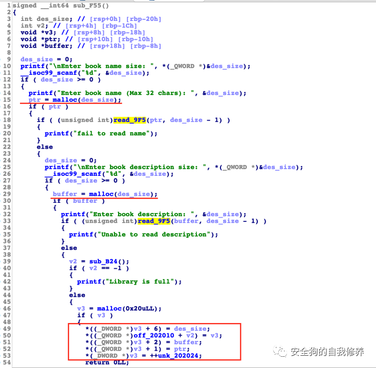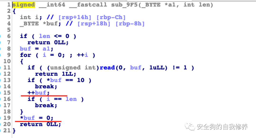 漏洞函数sub_9F5() 存在边界考虑不当,导致溢出一个‘\x00’字节。