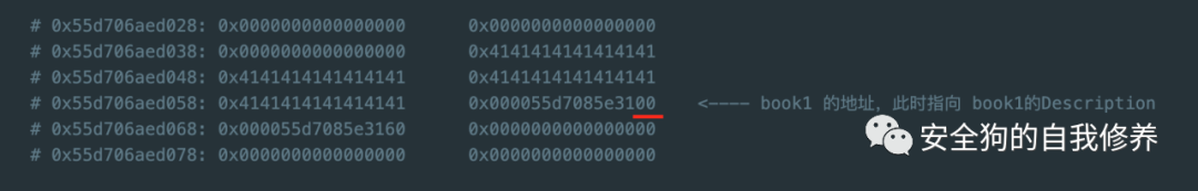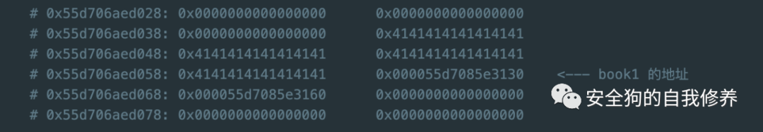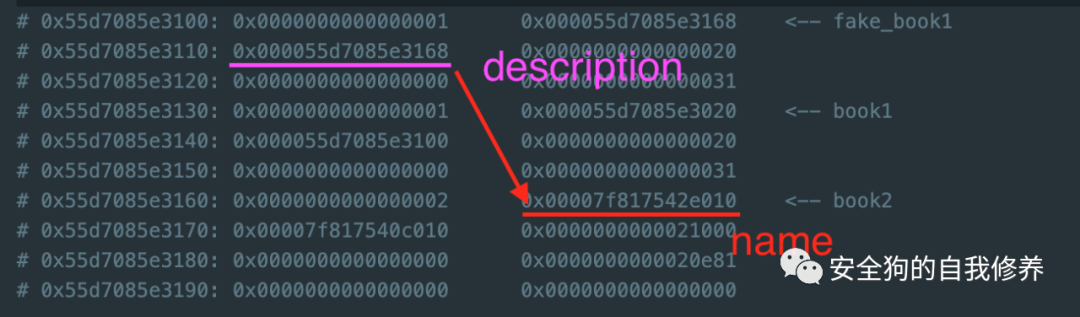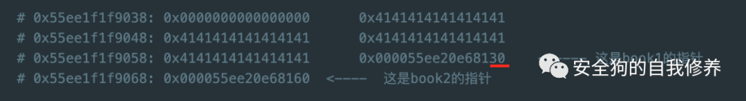 有了book1指针地址就可以计算出book2的指针地址,book1地址+0x30+0x8就是book2到name指针地址。
