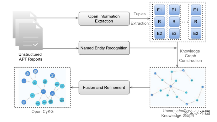 作者在该论文中提出了一个基于开放信息抽取系统(OIE)的开放式网络威胁抽取系统框架:Open-CyKG。其可以抽取非结构性APT报告数据,并把这些信息存于知识图谱,后者可进行高效的查询。
