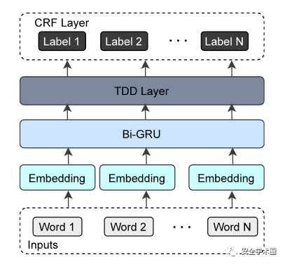 作者采用的OIE模型为采用BIO标注方案的序列标记模型,采用了双向GRU层、注意力机制、TDD层、Softmax层。