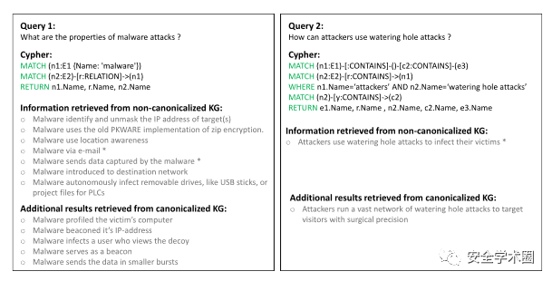 最终,作者提供了两个查询样例。其一是较为宽泛的问题,其二是较具体的针对水坑攻击的问题。作者以这两个问题来展示实体融合方案的效果。
