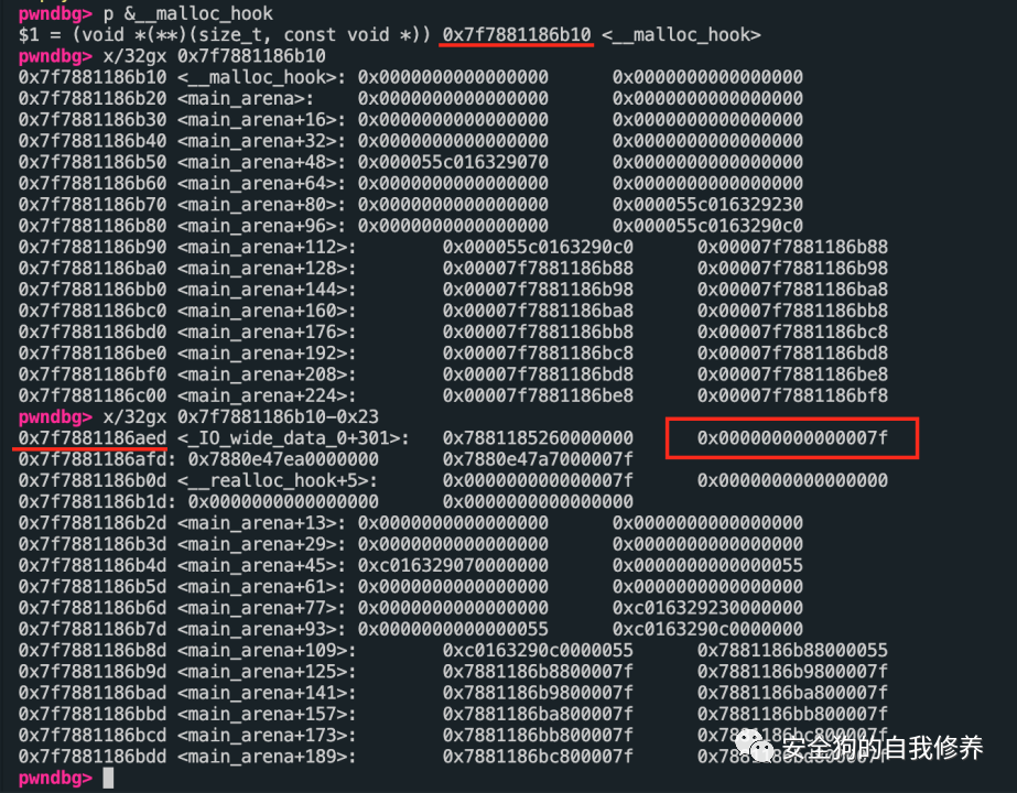 拿到malloc_hook 不能直接用,需要转换地址为 malloc_hook-0x23(因libc版本不同偏移不一样),因为需要符合do_check_malloced_chunk函数检查 ,这个位置刚好有个0x7f ,0x7f 检查符合NON_MAIN_ARENA ,IS_MAPPED, PREV_INUSE 。申请堆空间拿到malloc_hook-0x23 的返回地址,malloc返回是有偏移的,所以在之前地址上加0x10, 最终拿到的地址是 malloc_hook-0x23+0x10. 向申请的堆空间写入shellcode覆盖malloc_hook,那填充的偏移就为0x13