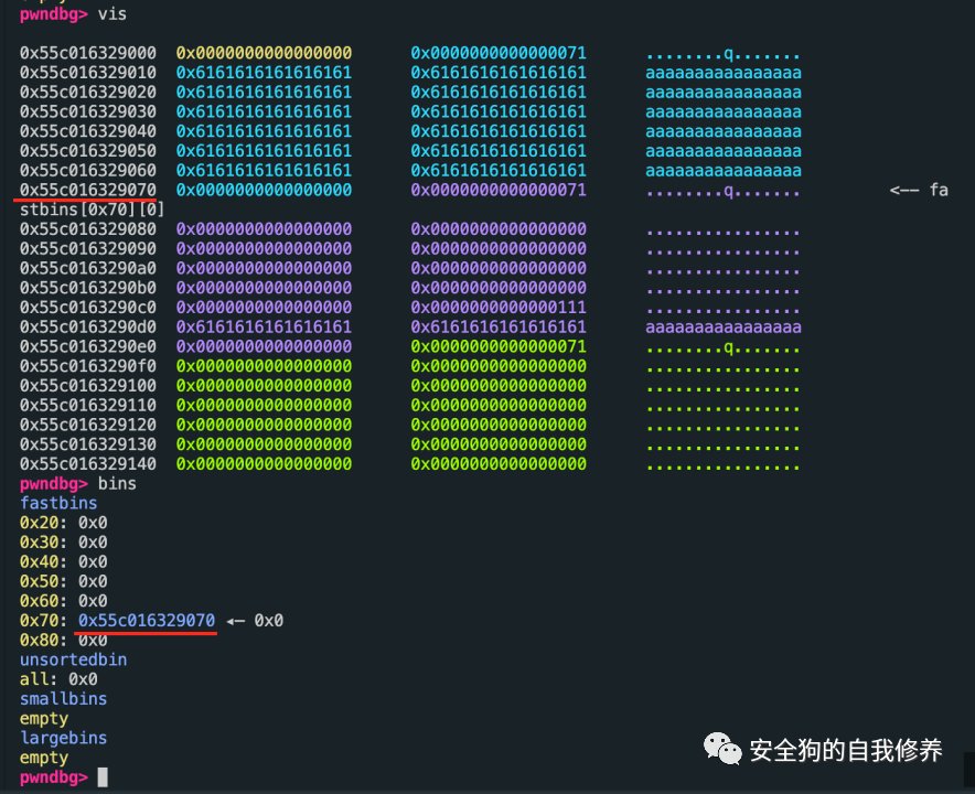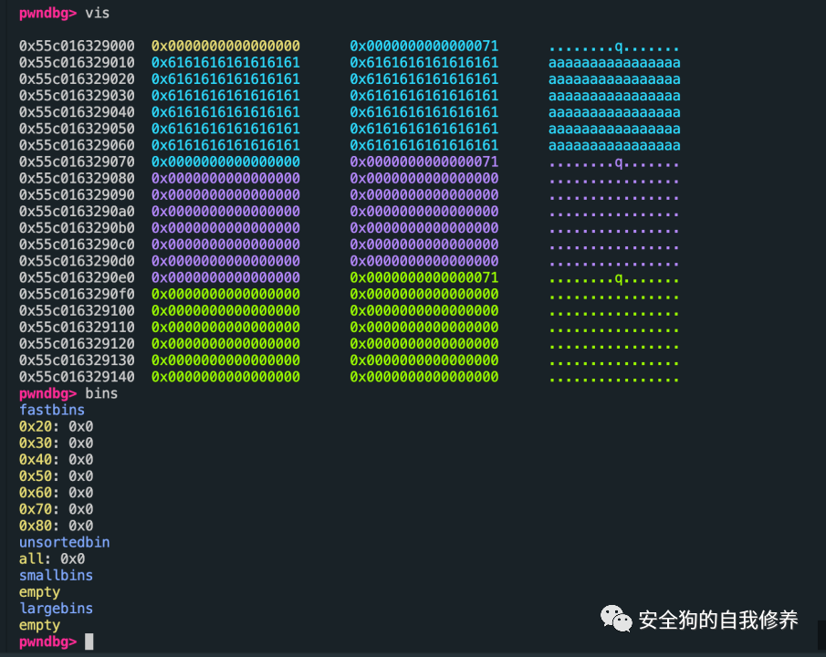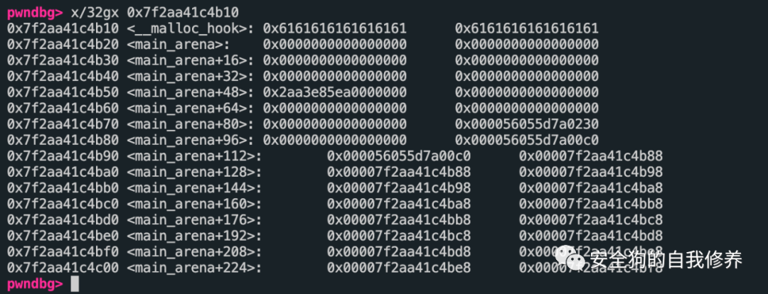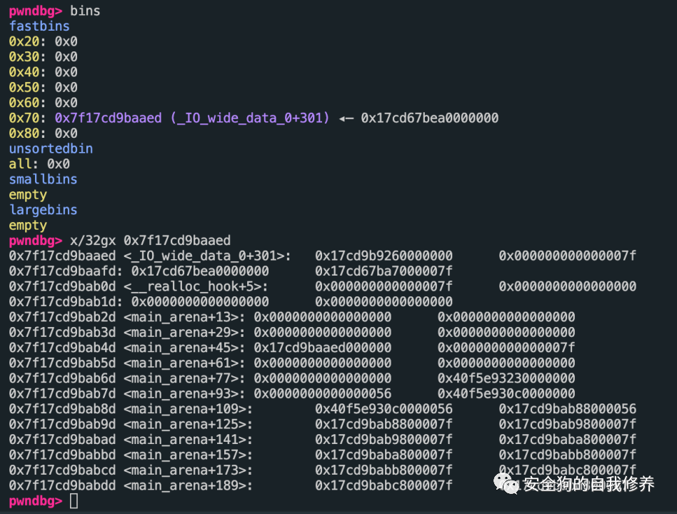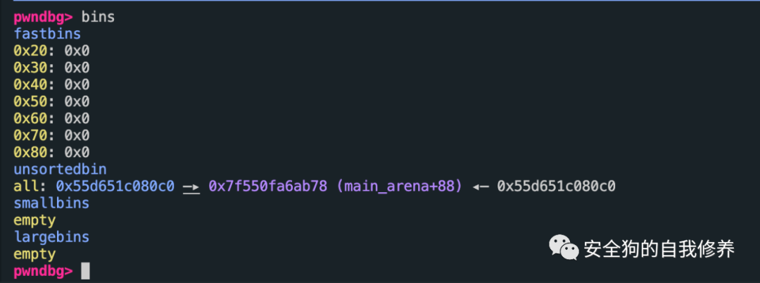 而在fastbin为空时,unsortbin的fd和bk指向自身main_arena中,该地址的相对偏移值存放在libc.so中,可以通过use after free后打印出main_arena的实际地址,结合偏移值从而得到libc的加载地址。