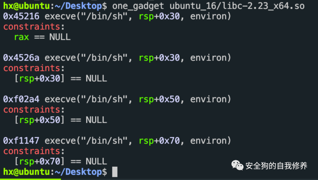 使用one_gadget 寻找libc-2.23_x64.so中可执行execve函数的gadget。