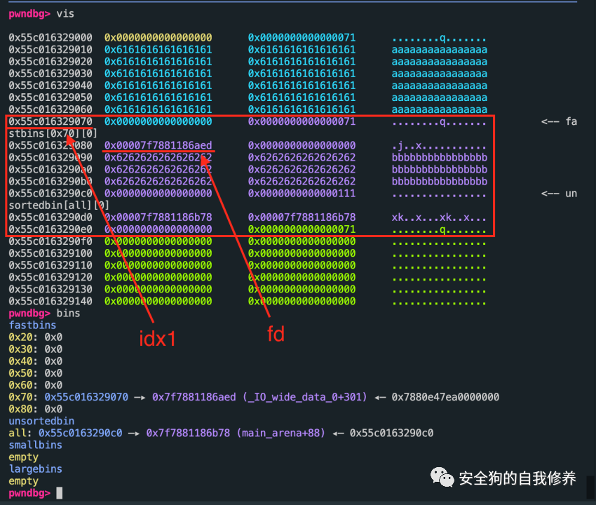 malloc(0x40)返回idx1堆块,在malloc的时候,fastbins会根据idx1的bk指针找到idx0,然后删除idx1堆块。如果能修改free掉的idx1中fd指针,把它指向一个想要的地方,那就可以实现任意写了。