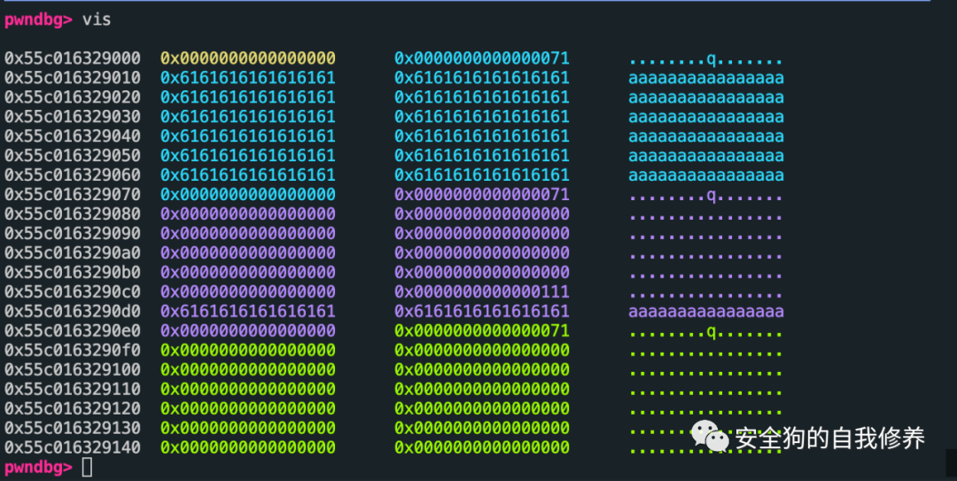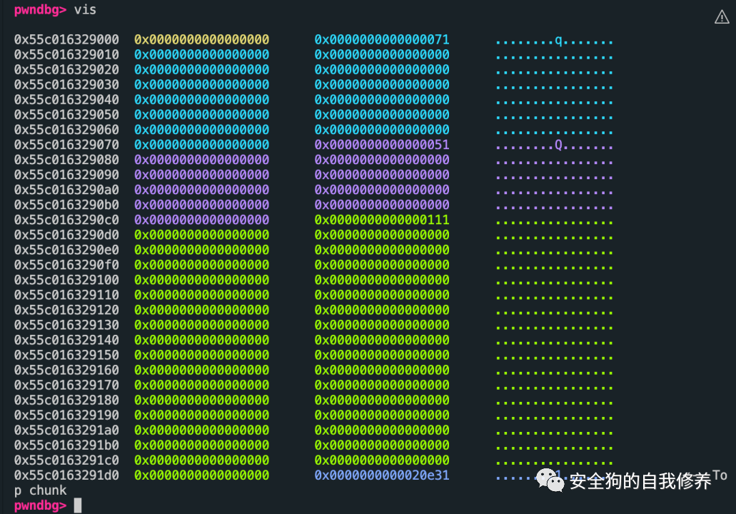 填充idx2块0x10大小的内容,要构造出idx1的大小,会重叠到idx2块中0x20范围,0x10为块头,0x10为内容填充,然后在增加一个堆头大小0x71.
