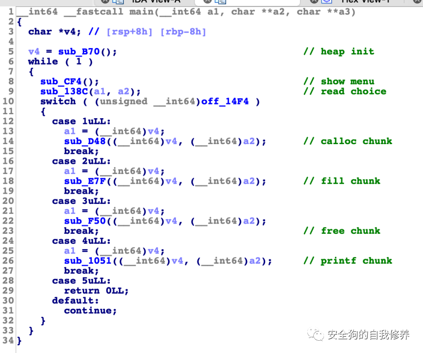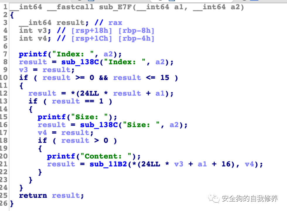 在sub_E7F()函数中存在堆溢出漏洞,可控制输入内容与大小。