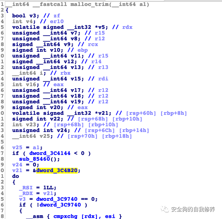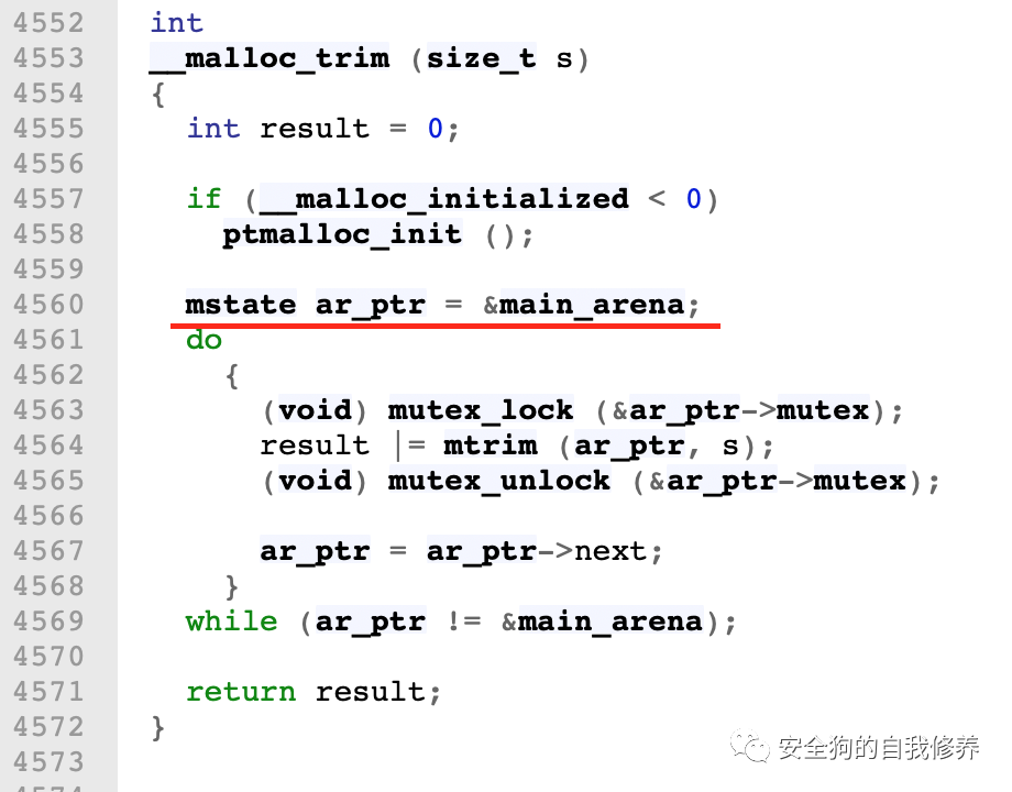 使用ida加载libc-2.23_x64.so 搜索malloc_trim函数,对照源码可得 0x3C4B20 是main_arena 的偏移地址。