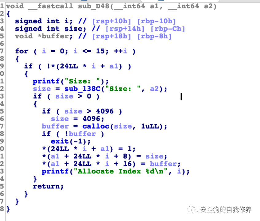 在 sub_d48()函数如下,使用了自己定义结构保存申请的堆。