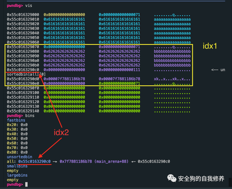 此时输出idx1块的内容,因与idx2有重叠部分 所以会泄漏出main_arena+88的地址。