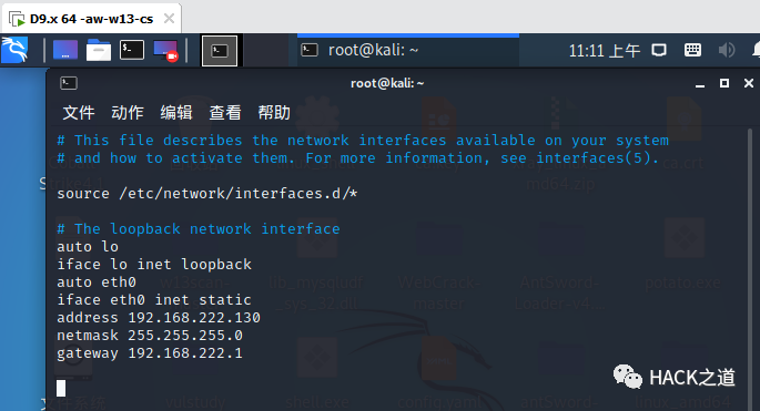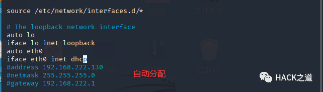 vim /etc/network/interfacesauto eth0#静态设置ipiface eth0 inet static /若dhcp则自动分配,下面即不需要,看清楚网卡与单词拼写#设置ip地址address 192.168.222.130#设置子网掩码netmask 255.255.255.0#设置网关gateway 192.168.222.1#重启reboot#重启服务systemctl restart networking临时配置IP,重启后不生效ifconfig eth0 192.168.222.130/24 #配置临时iproute add default gw 192.168.222.1 #配置默认路由