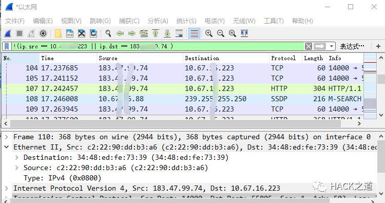 命令汇总:(1) MAC地址过滤eth.addr==20:dc:e6:f3:78:cceth.src==20:dc:e6:f3:78:cceth.dst==20:dc:e6:f3:78:cc(2)P地址过滤ip.addr==192.168.1.1 //根据IP地址筛选,包括源ip或者目的IPip.src==192.168.1.1 //根据源IP地址筛选ip.dst==192.168.1.1 //根据目的IP地址筛选(3)端口过滤tcp.port==80 //根据TCP端口筛选数据包,包括源端口或者目的端口tcp.dstport==80 //根据目的TCP端口筛选数据包。tcp.srcport==80 //根据源TCP端口筛选数据包。udp.port==4010 //根据UDP端口筛选数据包,包括源端口或者目的端口udp.srcport==4010 //根据源UDP端口筛选数据包。udp.dstport==4010 //根据目的UDP端口筛选数据包。(4)协议过滤常见协议:udptcparpicmpsmtppopdnsipsslhttpftptelnetsshrdpripospf(5)数据包过滤http.request.method==GEThttp.request.method==POST//筛选出http协议采用get/post方式的数据包。注意GET一定要写成大写,否则筛选不出来的。(6)逻辑运算|| //逻辑或&& //逻辑与! //逻辑非