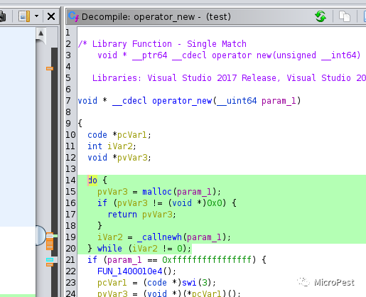 This is a library function written in the C programming language for allocating memory from the heap. It takes a parameter of type __uint64 (which typically represents an unsigned 8-byte integer) and then attempts to allocate that amount of memory from the heap. If the allocation is successful, the pointer to that memory is returned. If it fails, it calls the _callnewh internal function and checks the return value. If the _callnewh function fails, it calls either FUN_1400010e4 or FUN_14000edac depending on the value of the parameter, and then calls the swi function with an argument of 3 to determine what to do next.