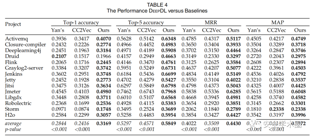 作者使用与Yan等人的文章[1]相同的数据集,如表1所示。在数据采集阶段,分别识别Bug代码行和Clean代码行。clean代码行作为训练数据集用于构建"Clean"的自然语言模型;bug代码行用作测试数据集以评估bug定位的性能。按照Yan等人的论文思路,本文选在与之相同的start date和end date区间,按照时间顺序选择前60%的commit用于模型训练,剩余的40%用于模型测试。