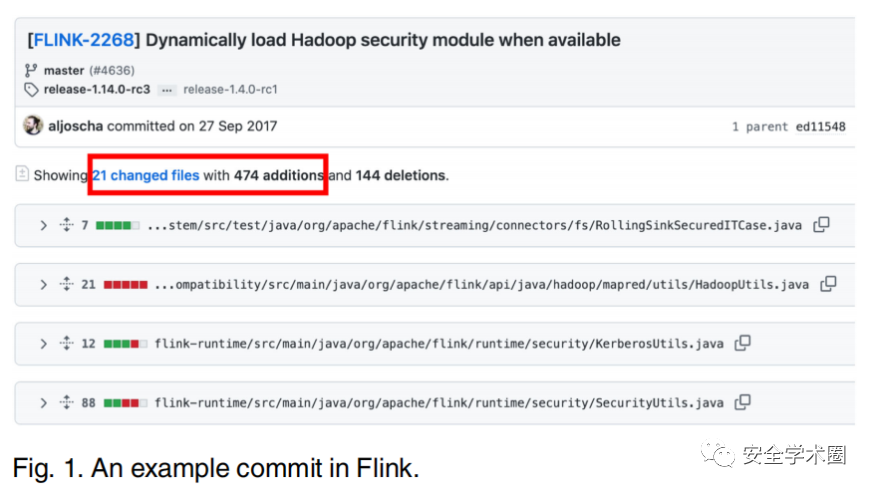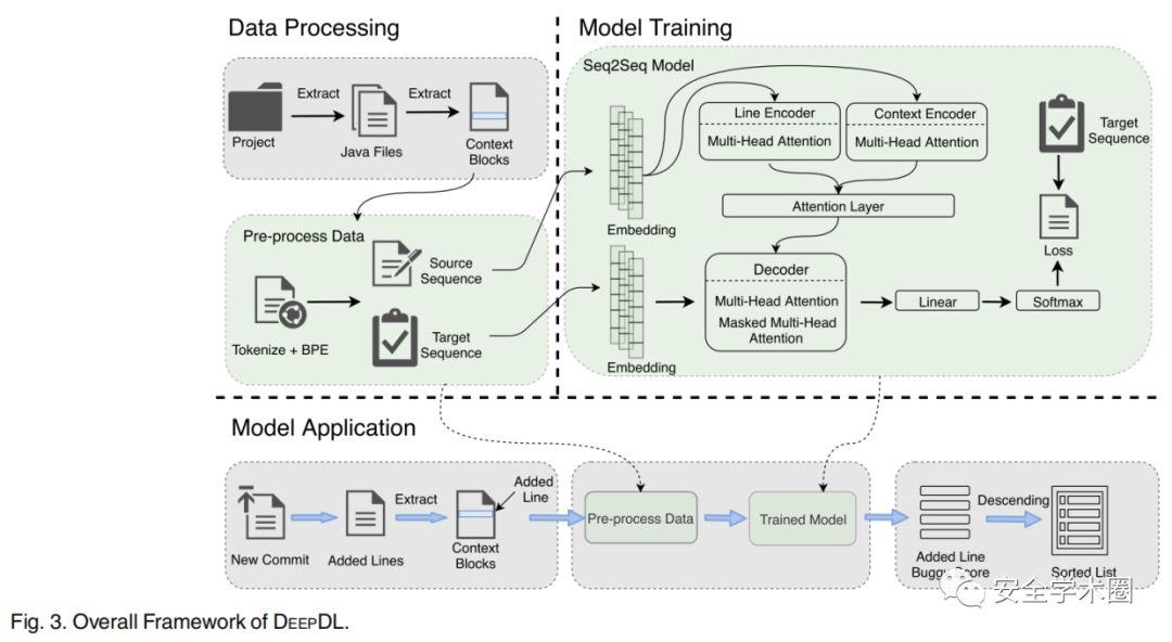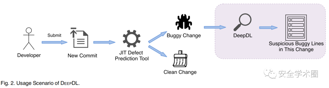 图1是作者给出的motivation示例。该commit的目的是"Dynamically load Hadoop security module when available",涉及对21个文件的change,其中包括474处添加和144出删除。在这个commit中手工地逐个检查改变的文件是费时费力的。因此,作者提出了DEEPDL工具,其使用场景为:(1)快速识别历史提交的缺陷位置。如图2所示,开发人员利用JIT缺陷预测工具来检测bug commit,然后使用DEEPDL根据检测出存在bug的代码行;(2)用来提醒开发人员在提交新的commit时识别潜在的bug位置。当开发人员提交代码变更时,DEEPDL可以自动定位可疑的bug代码并提供通知,从而帮助开发人员降低引入错误的风险,提高软件的可靠性。