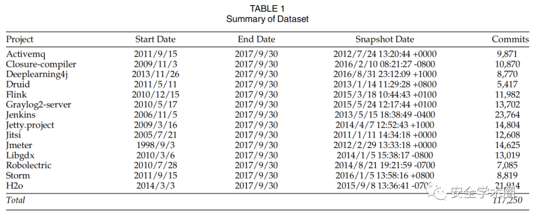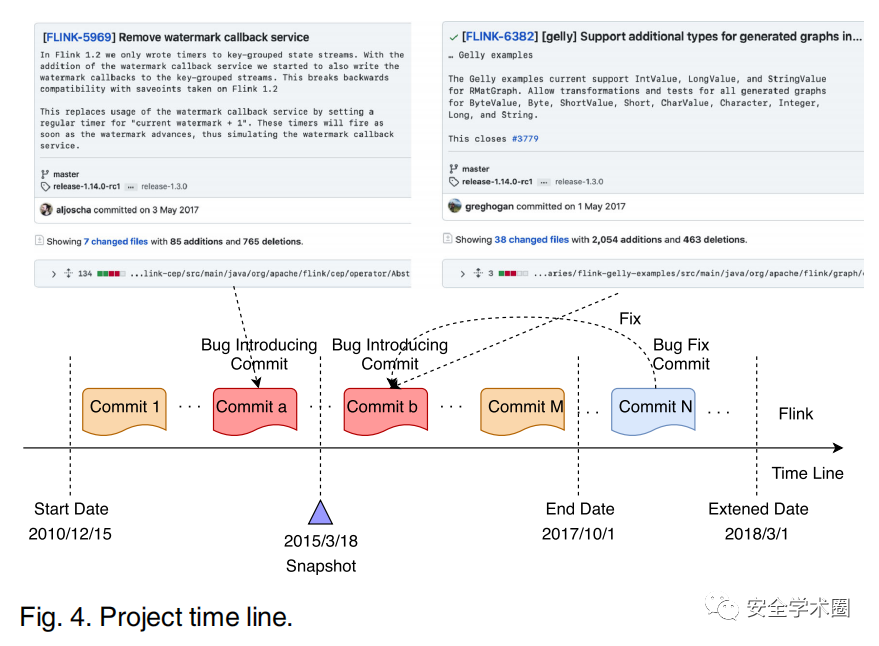 例如:如图4所示,对于Flink项目,首先统计从2010-12-15到2017-10-01时间段内的所有提交,共11982个Commit。接着,识别splitting commit(在2015-03-08发生),并用于切分训练和测试数据集;其中,日期位于splitting commit之前的commit用于训练,位于其后的用于测试。