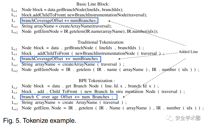 图5是利用BPE对Java代码片段进行token化的例子。"Basic Line Block"的第2行block.addChildToFront( newBranchInstrumentationNode(traversal);被基于BPE token化为一组子词单元序列:[‘block’, ‘.’, ‘add’, ‘Child’, ‘ToFront’, ‘new’, ‘Branch’, ‘In’, ‘stru’, ‘mentation’, ‘Node’, ‘(’, ‘traversal’, ‘)’, ‘;’]。在token化该行时,BPE算法遇到两个OOV词:addChildToFront和newBranchInstrumentationNode。对于newBranchInstrumentationNode,BPE将其拆分成一组字符,并通过运算将这些字符合并成词汇表中的已知词,即newBranchInstrumentationNode被转换成[ ‘new’, ‘Branch’, ‘In’, ‘stru’, ‘mentation’, ‘Node’ ]。