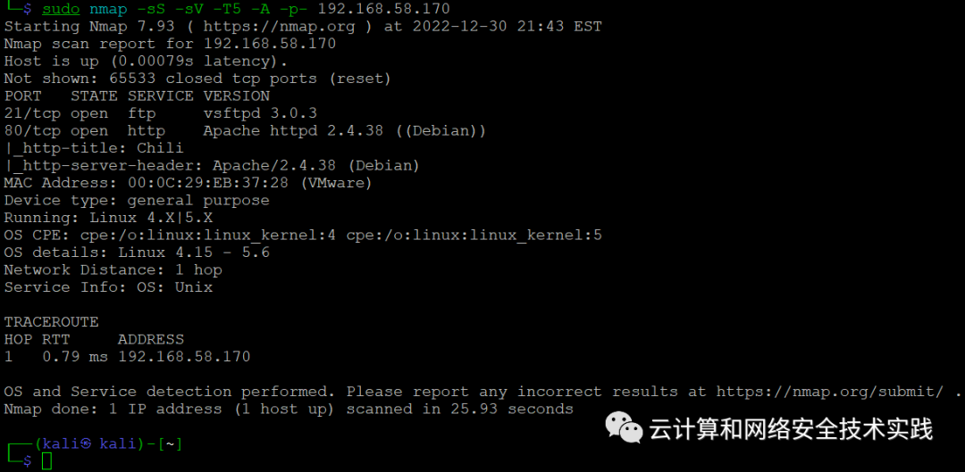 继续做端口扫描,sudo nmap -sS -sV -T5 -A -p- 192.168.58.170,