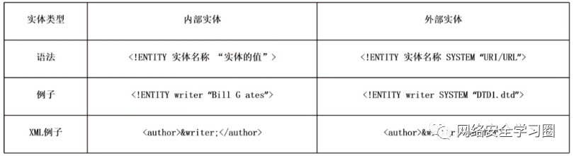 上面讲的那些都是内部实体,实体的值来源于内部,而外部实体顾名思义就是引用外部的值,两者的写法也差不多,外部实体仅仅是多了一个SYSTEM,给大家列了个表格这样大家可以更清楚一点,如下