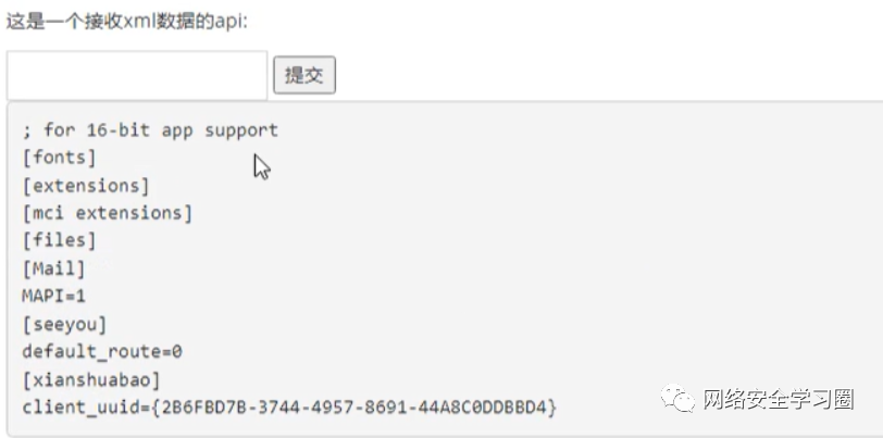 因为我是windows主机,这里我们以file协议来读取c:/windows/win.ini配置文件的内容,xml代码如下(注意这里的路径需要改变写法,不然会受到转义的影响)