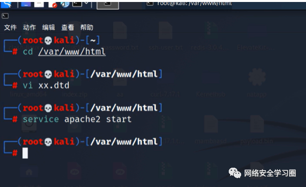 这里直接打开apache服务就可以达到这个效果了,主要是为了使xml代码能成功引用到kali的dtd文件
