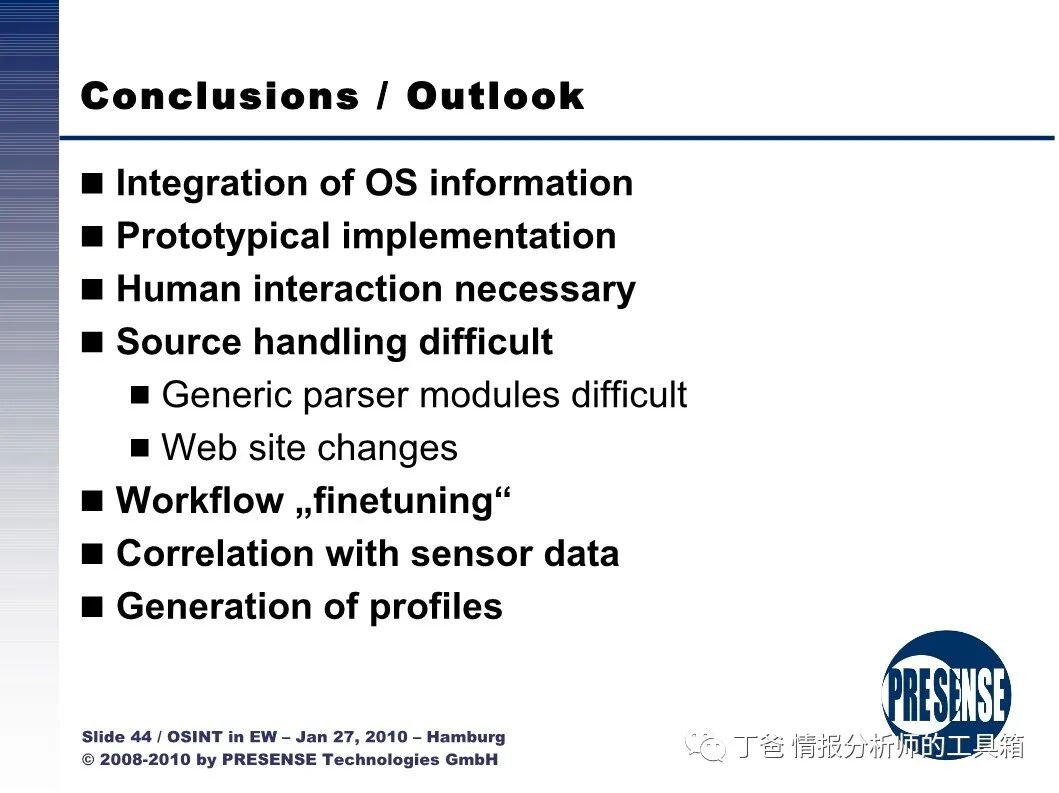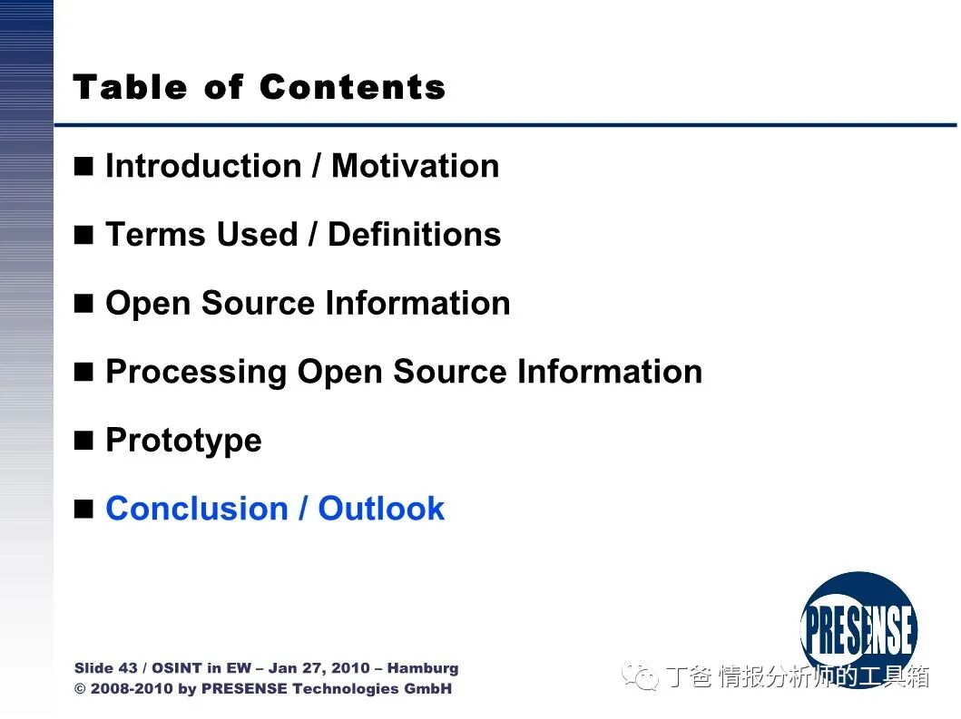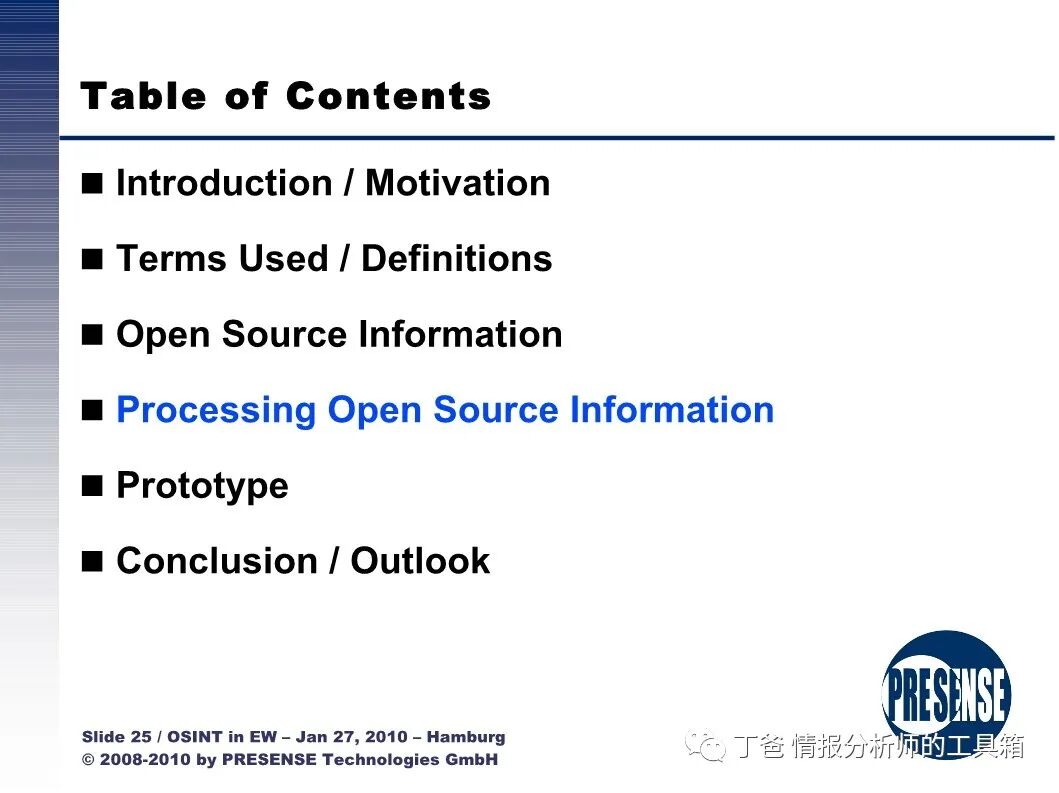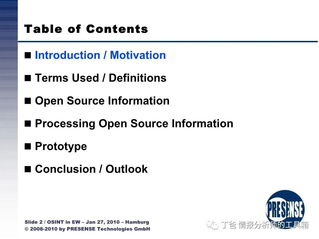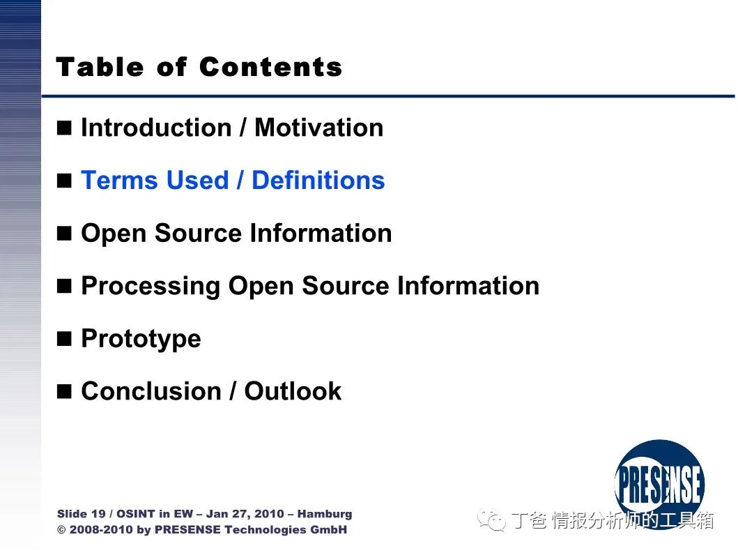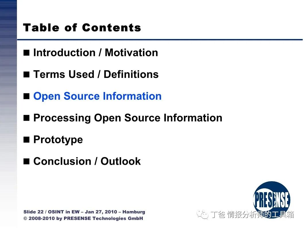 今天给大家推送的是德国软件公司PRESENSE Technologies GmbH的专家的PPT《在早期预警信息中整合开源信息中的谣言和事实》目录介绍/动机使用术语/定义开源信息处理开源信息原型结论/