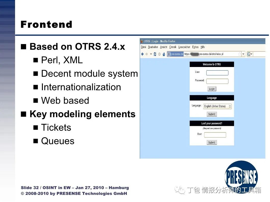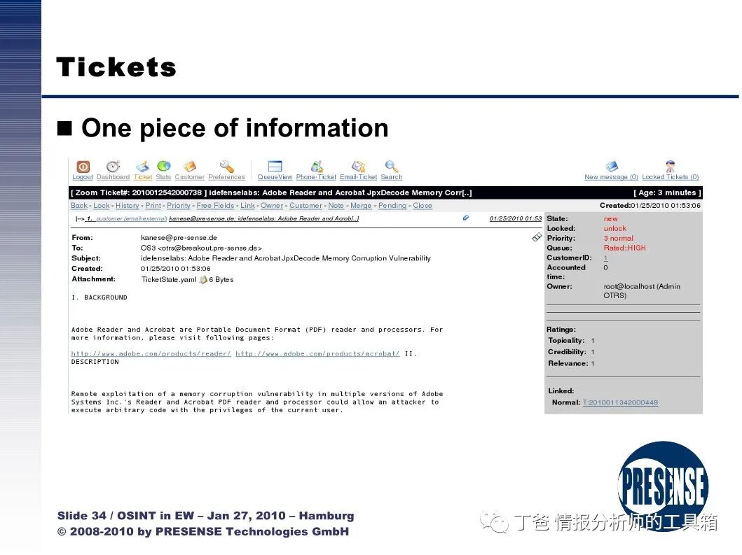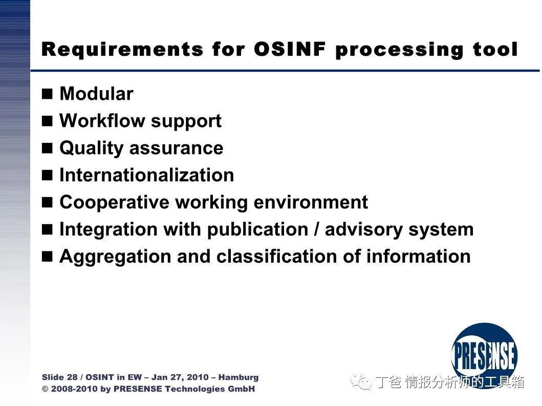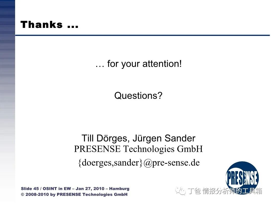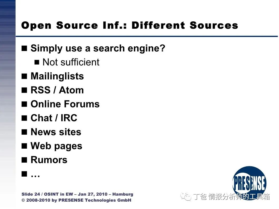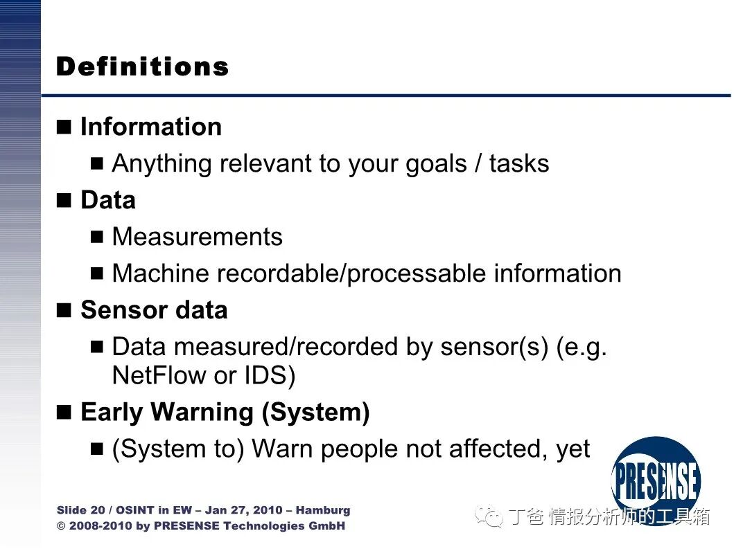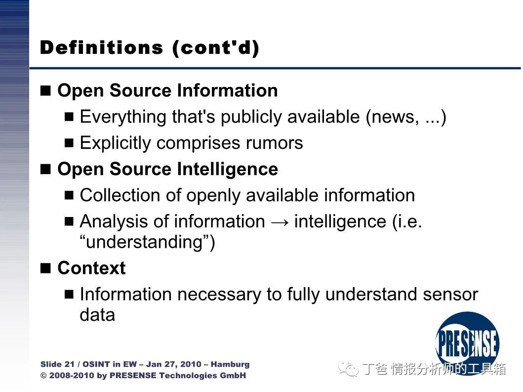 今天给大家推送的是德国软件公司PRESENSE Technologies GmbH的专家的PPT《在早期预警信息中整合开源信息中的谣言和事实》目录介绍/动机使用术语/定义开源信息处理开源信息原型结论/