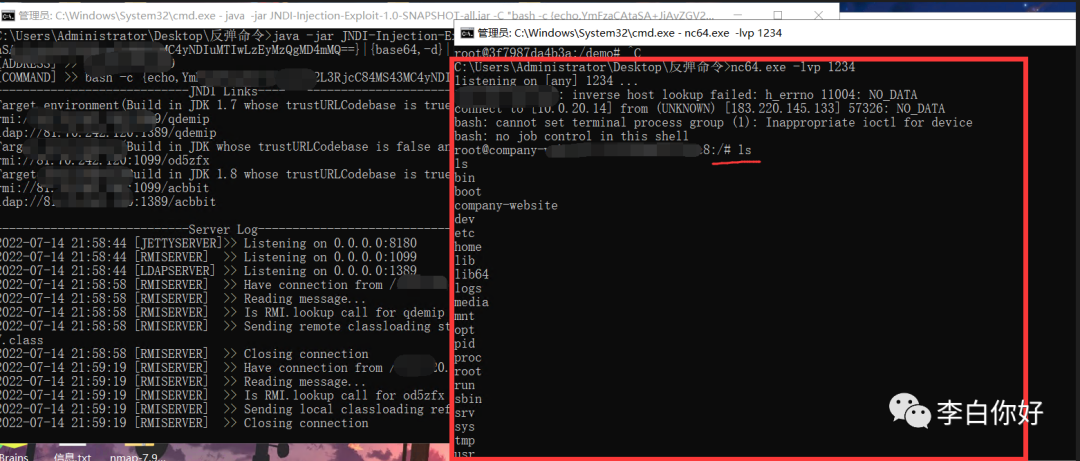 然后利用jndi注入工具在攻击机上开启jndi服务器,利用payload开始攻击,获得反弹shell