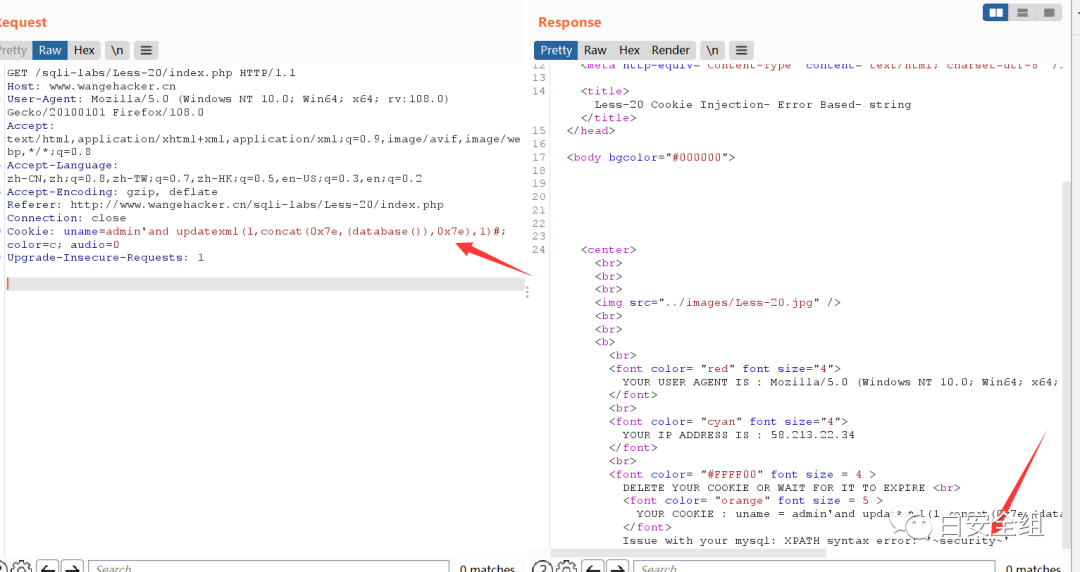 ' and updatexml(1,concat(0x7e,(database()),0x7e),1) and 'or 1=1less-20 cookie注入:
