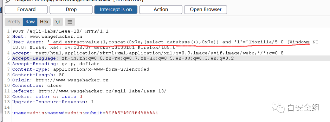 insert into 'security'.'某个表'(uagent,ipadd,username) values('' and extractvalue(1,concat(0x7e,(select database()),0x7e)) and '1'='1','ip地址','用户名')less-19referer注入: