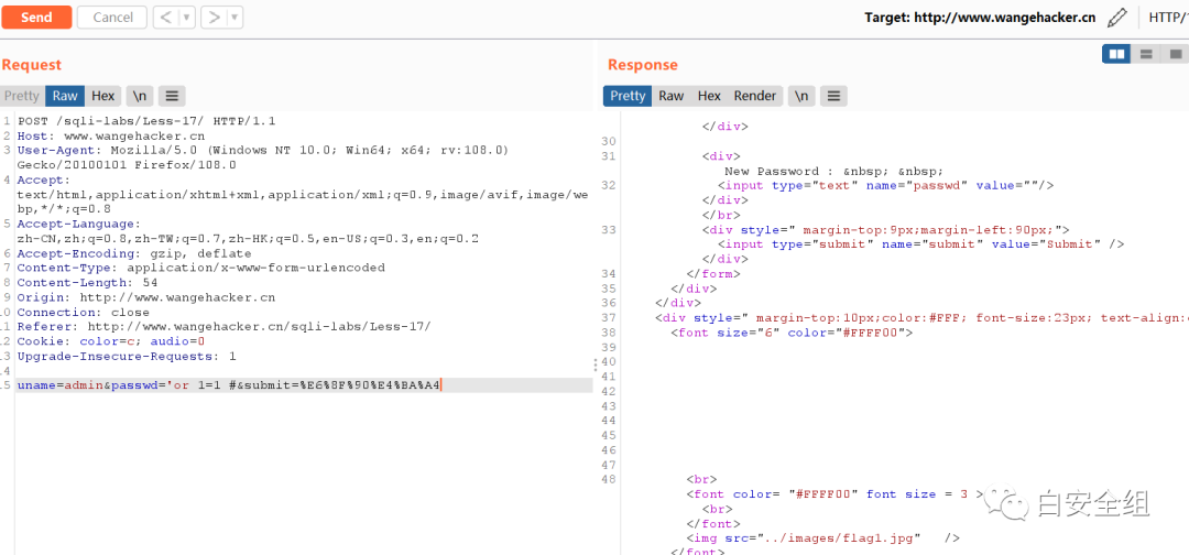 admin' and if(ascii(substr(database(),1,1))=115,sleep(5),null) #less-17修改密码,密码重置漏洞
